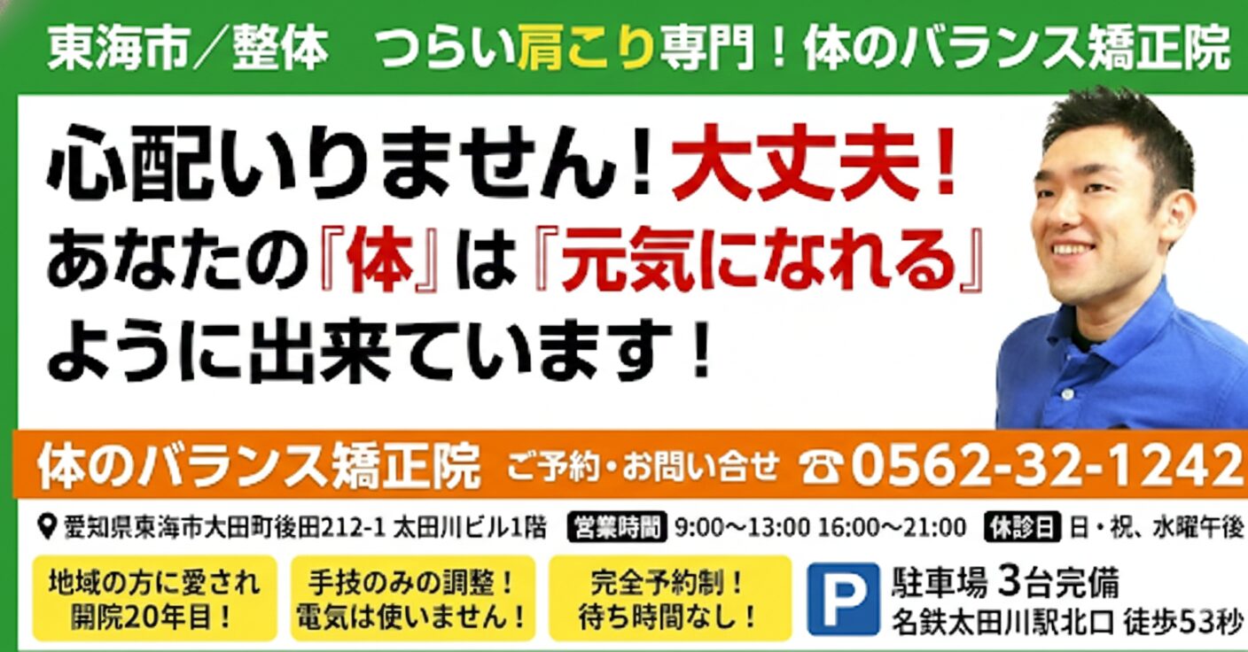 肩こり、頭痛、腰痛、ヒザ痛などの自覚しているの痛み枝葉に過ぎず、原因の根っこは「全身のバランス」の悪さにあります。当院は「全身バランス調整のプロフェッショナル」として、症状が出ている局所ではなく、全身のゆがみを徹底的に調整していきます。